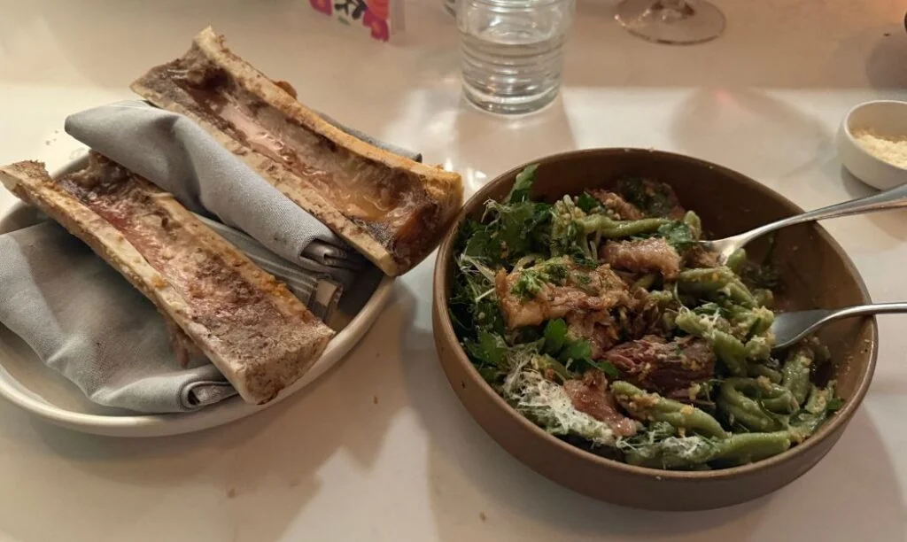 This dish arrives in two parts: one bowl with spinach casarecce pasta, short rib, herbs, and pecorino, and another with two massive bone halves. Nick scooped the bone marrow out and mixed it into the pasta tableside, and then it was game time.