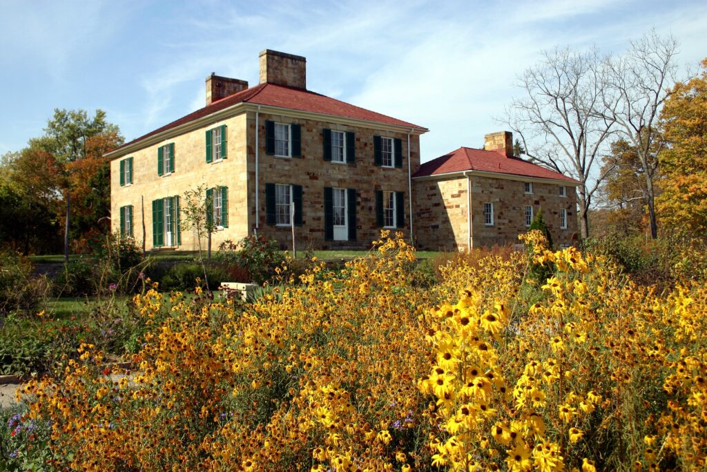 Situated on the 300 remaining acres of the original home place are five outbuildings and formal gardens. The gardens have undergone major renovations. Visitors may stroll through three terraces of flowers and vegetables, as well as the shrubs and trees in the grove. Looking east from the north lawn of the mansion one can see across the Scioto River valley to the Logan Range. This view is the inspiration for the Great Seal of the State of Ohio.