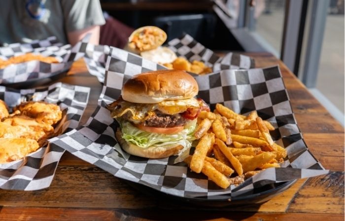 The menu features classic pub fare, like southwest egg rolls, coated fries, burgers, and more.