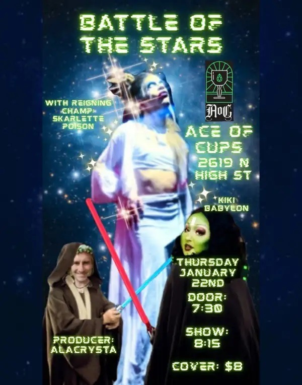 Are you a STAR? Then our stage is for YOU! At Ace of Cups, we take pride and joy in offering a hot, fun, safe space for you to showcase your craft and show Columbus what you are made! We accept a plurality of acts including drag and burlesque, live musical performance, all forms of dance, magic, comedy, spoken word, performance art and more! Whether you are a brand new performer looking to gain some stage time under your belt, or a seasoned entertainer looking to test out some new material and keep your claws sharp, we are the place for YOU!!!! To join and perform, please contact Kiki Babylon directly. The winner will receive a cash prize and a paid booking to come back and co-host with me! We can’t wait to see you there on Thursday, January 22nd!!