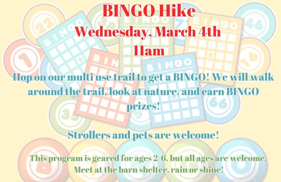 Hop on our multi use trail to get a BINGO! We will walk around the trail, look at nature, and earn BINGO prizes!