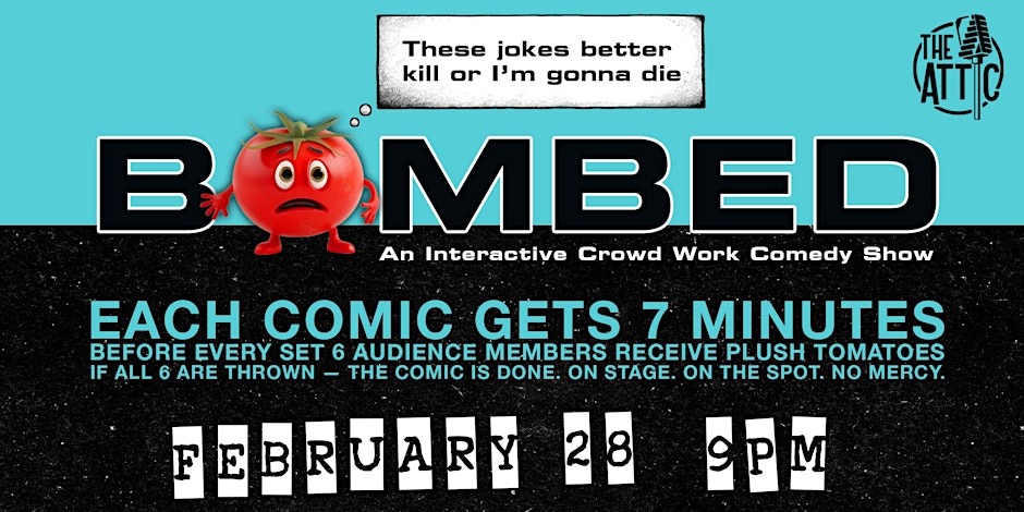 BOMBED – An Interactive Crowd Work Comedy Show in Columbus, OH Date Night just got dangerous. Join us Saturday December 6th at 7:00 PM for BOMBED — a wild, unpredictable comedy show at The Attic Comedy Club where the audience gets the power… and the tomatoes.