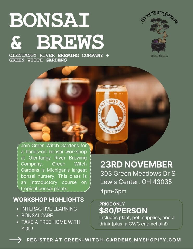 Join Green Witch Gardens at Olentangy River Brewing Company for an introductory course on tropical bonsai! The art of Bonsai is good for the soul, many compare it to meditation! This class is just like our regular Intro to Indoor Bonsai Class, but with your ticket, you also get a drink and a collectible Green Witch Gardens logo enamel pin! You will learn all about tropical bonsai, then you will get to pot up your own tree to take home.