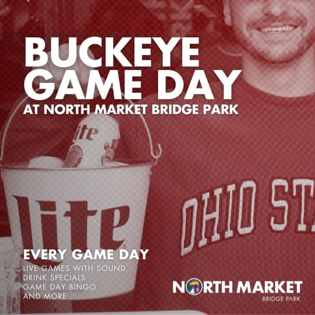 Join us this fall at North Market Bridge Park for the ultimate Buckeye Game Day experience! We’ll be showing every OSU Buckeye football game LIVE all season long — so throw on your scarlet and gray, bring your game face, and cheer on the Buckeyes with fellow fans.