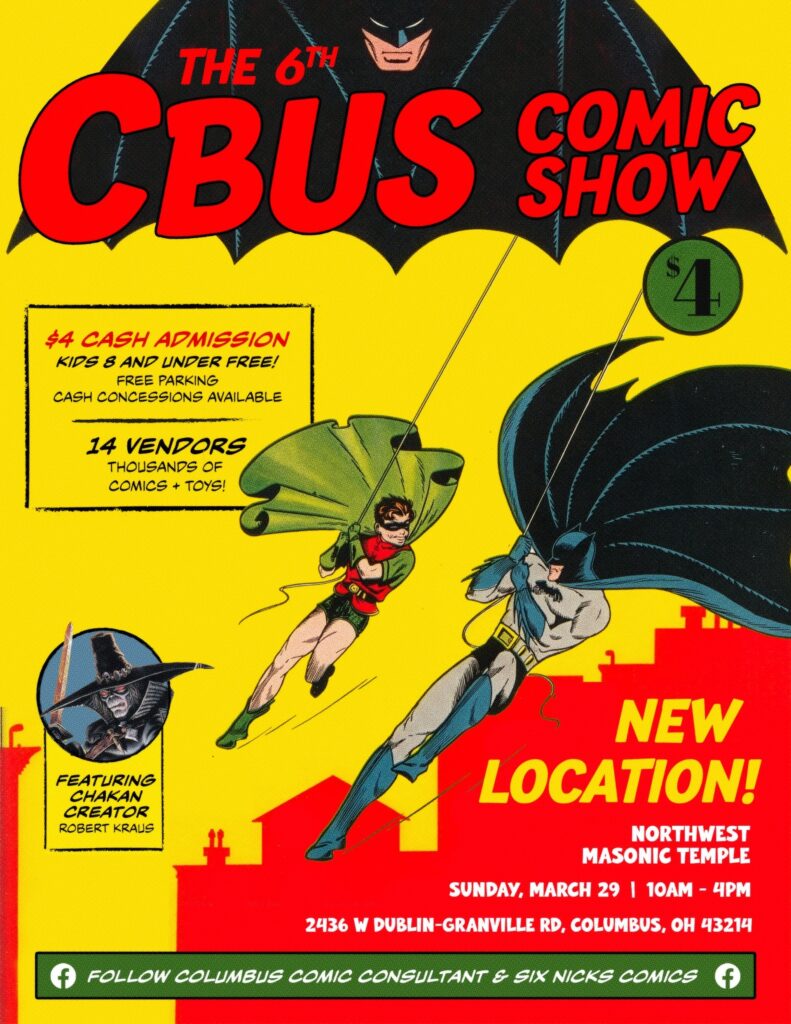 The C-Bus Comic Book Show is back! But it’s in a NEW LOCATION! Our sixth show is taking place at the Northwest Masonic Temple on W. Dublin Granville Rd on Sunday, March 29th. It will have everything that made the last five shows great, including 14 vendors with thousands and thousands of comics for all budgets, toys, artists, concessions and free parking! Robert Kraus, the creator of Chakan, will be returning! Admission is still only $4 and kids 8-years-of-age and under still receive free admission! This is the best little comic book show in all of Ohio. Make sure to stop by and find out why! Hope to see you there!