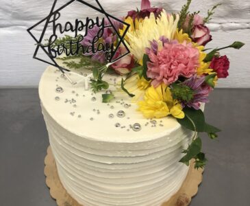 This class will teach you how to assemble a buttercream cake decorated with fresh flowers. Each student will receive two layers of cake, buttercream, and detailed instructions on how to trim, fill, stack, and ice your cake. While your cake chills in the fridge, enjoy a glass of wine while building flower clusters to decorate your cake. A box will be provided to transport your masterpiece home!