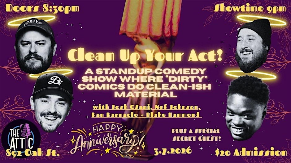 Clean Up Your Act is a clean(ish) comedy show where handpicked local and regional “dirty” comics have to do their best to keep things clean.