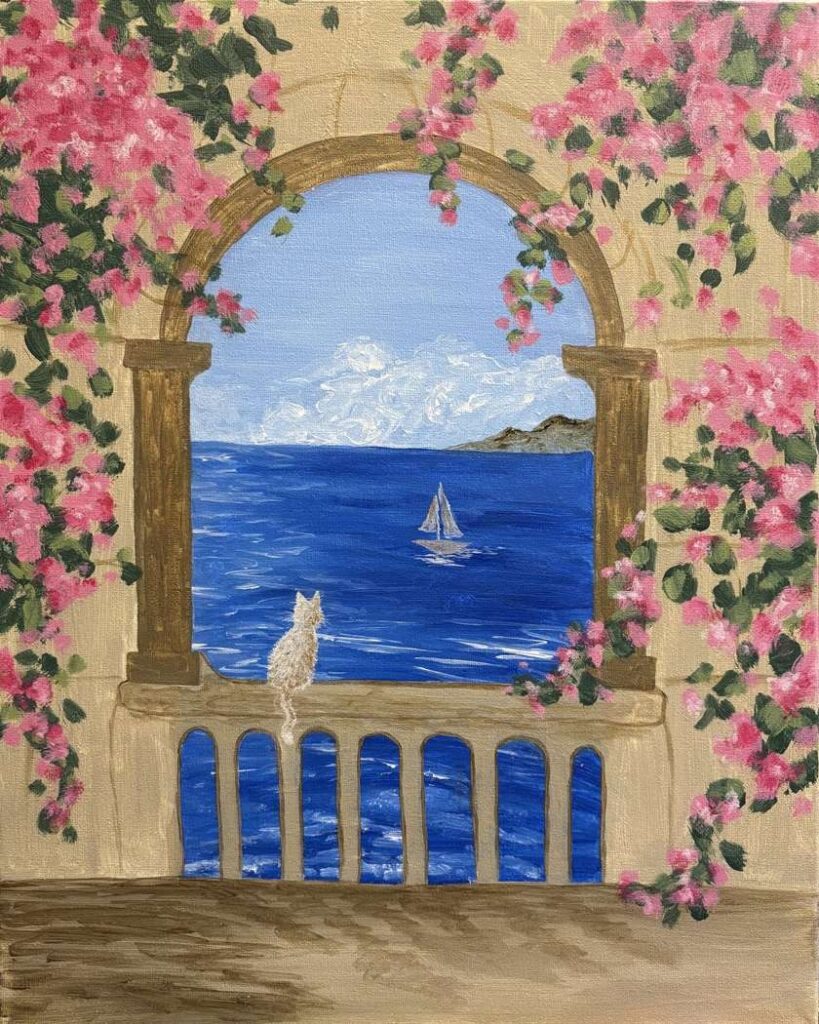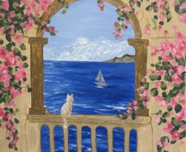 A beautiful oceanside view of a sailboat, through an archway somewhere in Greece. There are blooming flowers along the walls, and a small white cat perched on top of the rail.