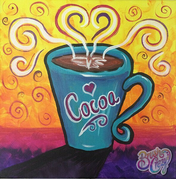 Come in and get a little Brush Crazy! Cocoa Love is our featured painting. We have step by step instructions, with pictures and words for you to follow along as you customize your very own art project!