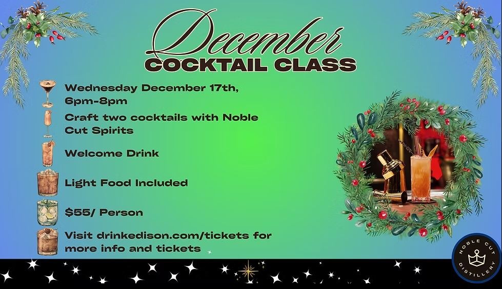 This is the first class in our four-part winter series! Attendees will be welcomed with a cocktail upon arrival before diving into an interactive evening of mixology. A representative from Noble Cut Distillery will discuss the art of cocktail creation and guide you through two themed cocktail recipes.