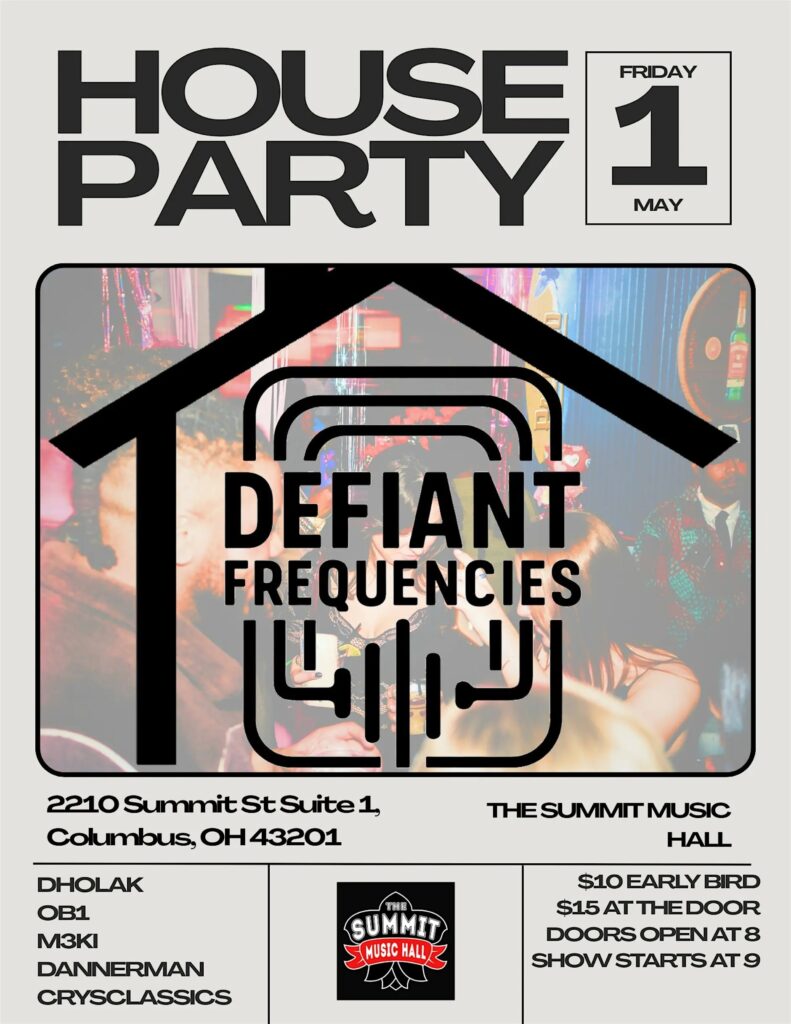 Line Up THE DEFIANT – HOUSE PARTY For the first time ever, Defiant Frequencies is making our debut inside an actual music venue in Columbus… and we’re doing it the only way we know how. We’re turning The Summit Music Hall into a fully immersive HOUSE PARTY experience — intimate crowd, curated sound, and a custom production + decoration setup built specifically for the house music culture. This isn’t just another show… This is a special moment for the Defiant community and we’re inviting Columbus to be part of it. Expect a packed out show, heavy grooves, and a night that feels like the underground house parties that started it all. Featuring sets from: DHOLAK OB1 M3KI DANNERMAN CRYSCLASSICS