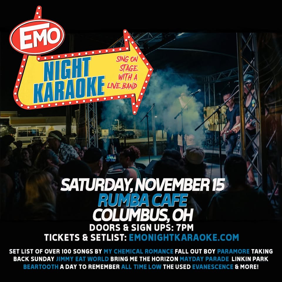 Emo Night Karaoke with a live backing band on Saturday, November 15 at Rumba! We play, you sing with a live band on stage with full production and visuals!