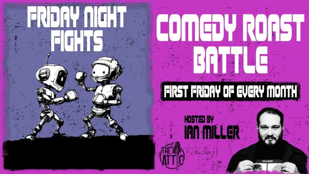 Friday Night Fights Comedy Roast Battle – Hosted by Ian Miller! Columbus’ most savage roast battle goes down every First Friday at The Attic Comedy Club! Get ready for Friday Night Fights, a no-holds-barred comedy showdown where Columbus’ funniest comics go head-to-head in a battle of wit, insults, and pure roast mastery. Hosted by Ian Miller, this fast-paced, high-energy show will have you laughing, gasping, and cheering as comics trade brutal, hilarious takedowns in front of a packed house. What to Expect:
