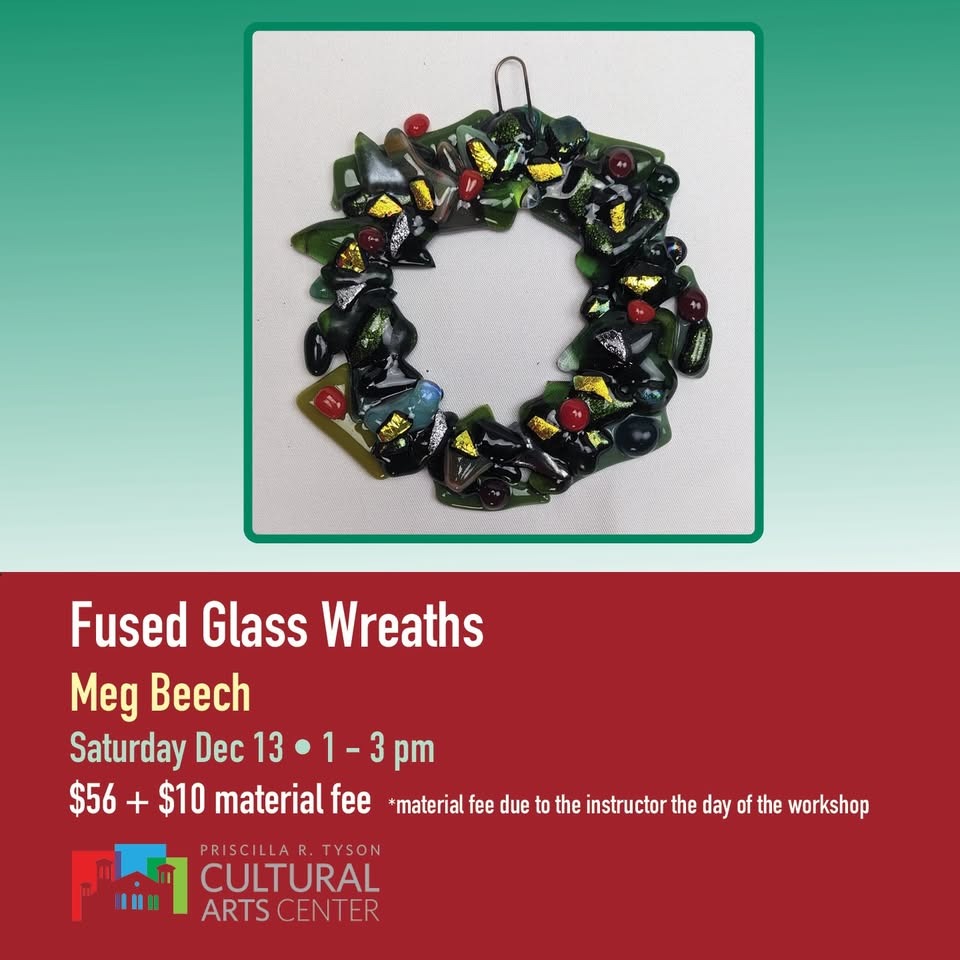 Description: Learn about the glass fusing process and how to cut glass. You will arrange the glass which will then be fired in the kiln and picked up at a later date. You will make one fused glass wreath (approx. 6-7″) to use as holiday decoration.