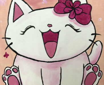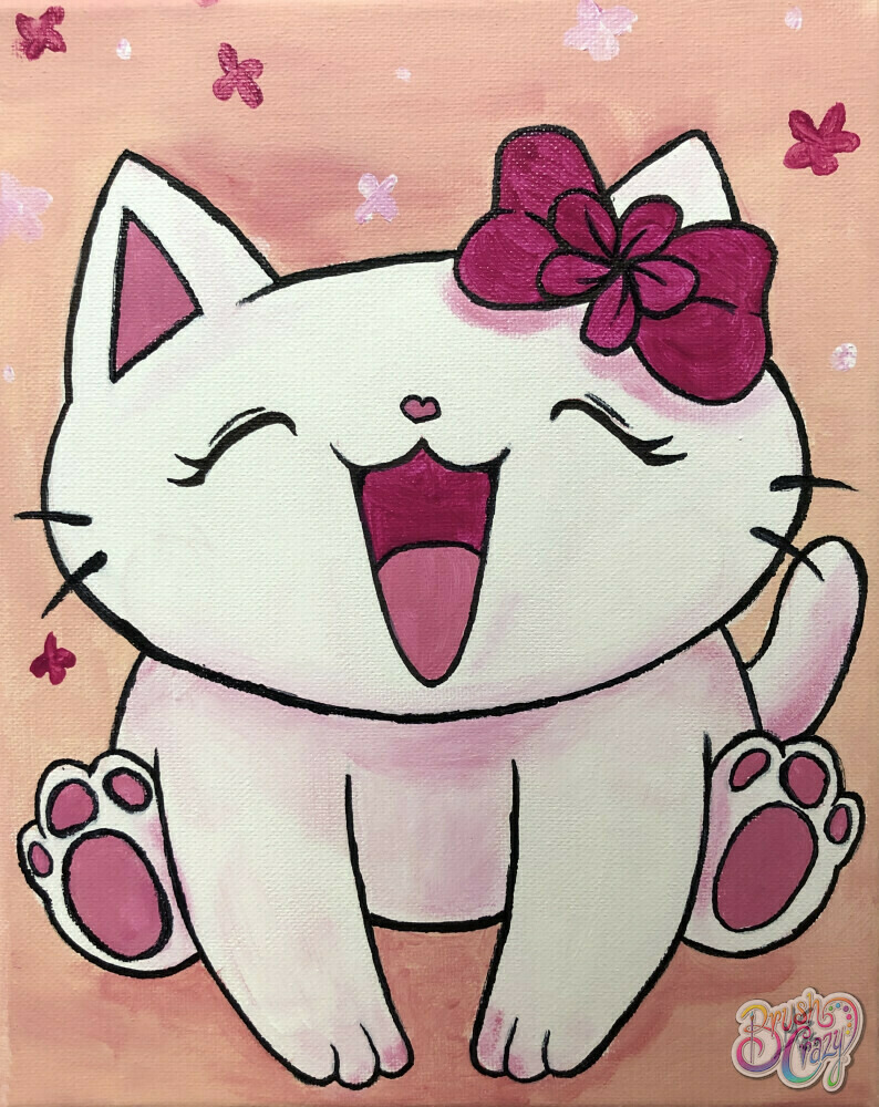 Come in and get a little Brush Crazy! Happy Kitty is our featured painting. We have step by step instructions, with pictures and words for you to follow along as you customize your very own art project!