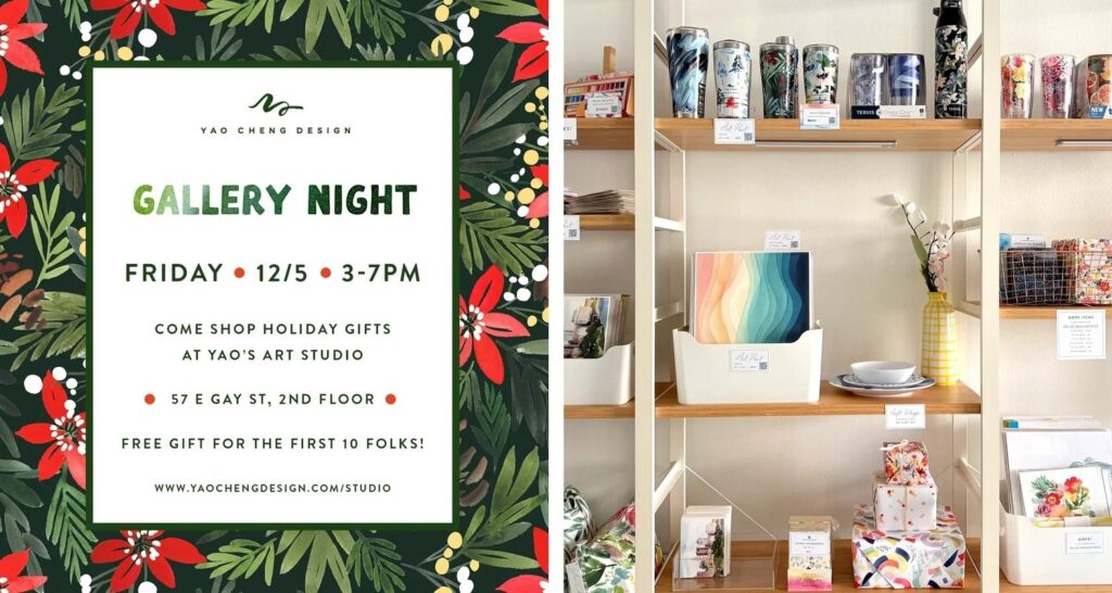 Come shop and view Yao Cheng’s joyful handmade watercolors at her Gallery Night: Art Prints, Dish Towels, Gift Wrap, Greeting Cards and Original Paintings. Light refreshments and snacks will be provided.