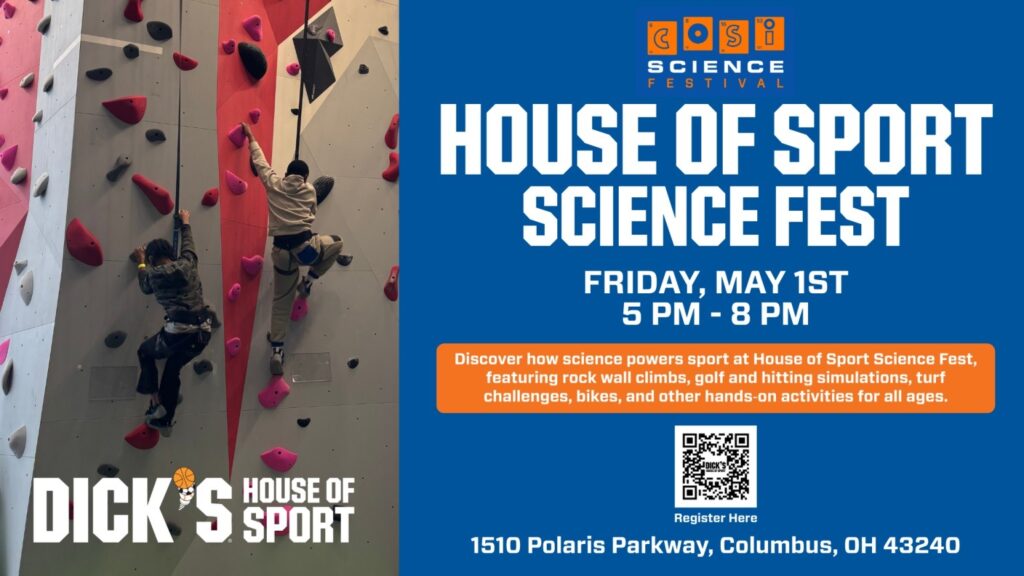 House of Sport Science Fest   Bring the whole family for an evening of hands‑on discovery at the House of Sport Science Fest, an interactive STEAM open house that explores the fun and fascinating connection between sports, movement, technology, and everyday science. We are excited to partner with COSI for this COSI Science Festival Community Event!   Friday, May 1st | 5–8 PM DICK’S House of Sport (1510 Polaris Parkway, Columbus, OH 43240)   Guests of all ages are invited to step into the role of “scientist” as they travel through interactive stations spread throughout the store.   Upon arrival, guests will check in at the main entrance, receive a wristband and a themed Science Passport, and then navigate the event at their own pace. Each activity completed earns a stamp—and the more stamps collected, the bigger the rewards. Prizes range from sunglasses and stress balls to free climb passes, with a grand prize entry for a House of Sport birthday party for anyone who completes all stations.   We are proud to partner with the following organizations for our science stations: StretchLab Powell, KidStrong Polaris, Grace Haven Ohio, Makerspace Central, and more!   Everyday Science