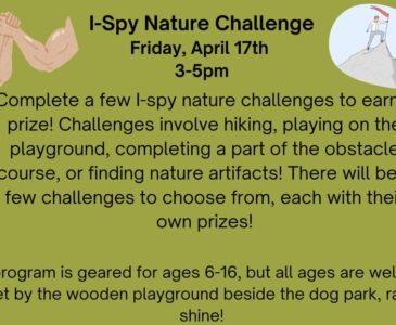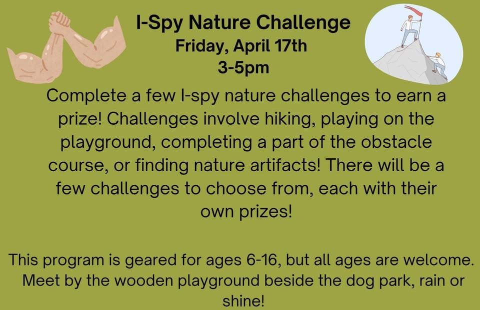 Complete a few I-spy nature challenges to earn a prize! Challenges involve hiking, playing on the playground, completing a part of the obstacle course, or finding nature artifacts! There will be a few challenges to choose from, each with their own prizes!