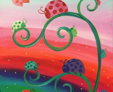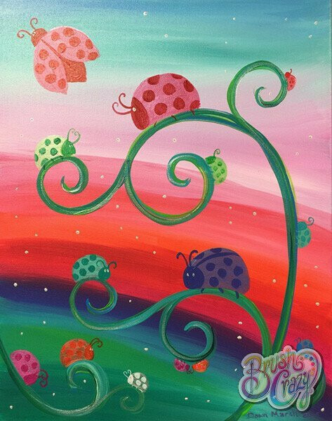 Come in and get a little Brush Crazy! Ladybug Rainbow is our featured painting. We have step by step instructions, with pictures and words for you to follow along as you customize your very own art project!