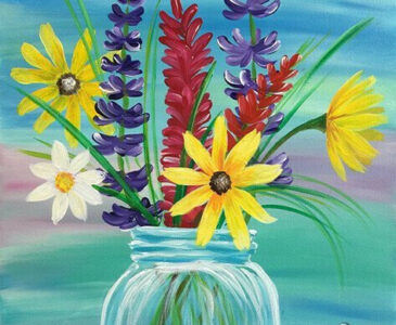 Come in and get a little Brush Crazy! Mason Jar with Flowers is our featured painting. We have step by step instructions, with pictures and words for you to follow along as you customize your very own art project!