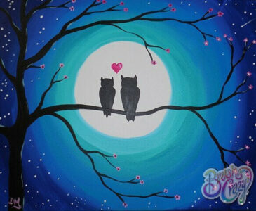 Come in and get a little Brush Crazy! Owl Romance is our featured painting. We have step by step instructions, with pictures and words for you to follow along as you customize your very own art project!