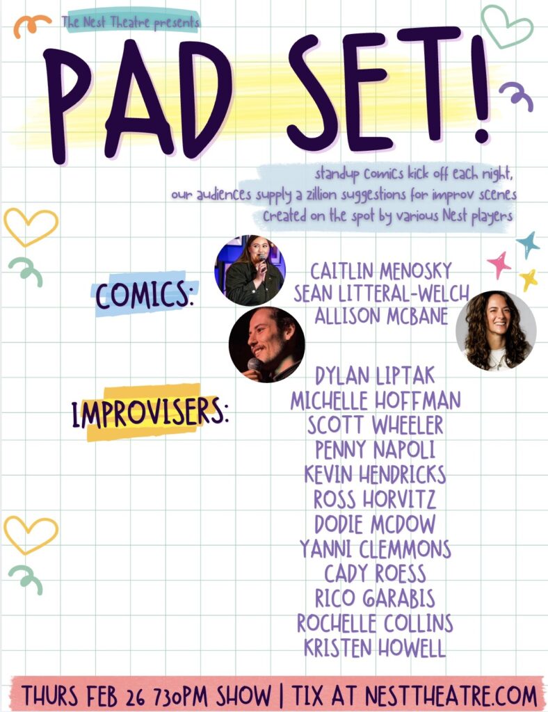 Longform improv is most easily described as an improvised set of scenes and characters inspired from a single suggestion. PAD SET front loads the show with a full pad of suggestions that will be used EACH and EVERY scene!