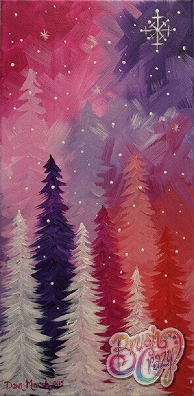 Come in and get a little Brush Crazy! Pine Trees in White is our featured painting. We have step by step instructions, with pictures and words for you to follow along as you customize your very own art project!