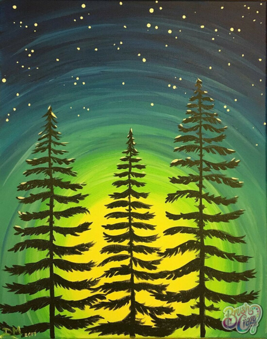 Come in and get a little Brush Crazy! Pine Trio Moon Glow is our featured painting. We have step by step instructions, with pictures and words for you to follow along as you customize your very own art project!