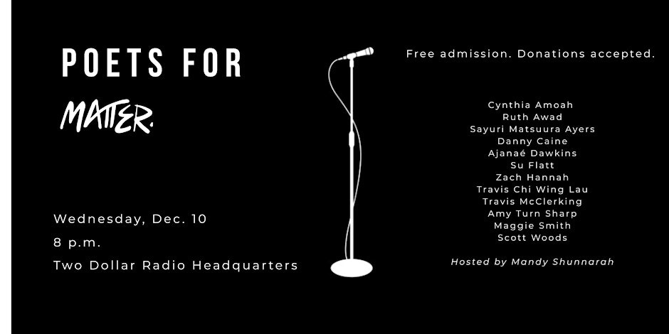 Join us at Two Dollar Radio Headquarters at 8 p.m. on Wednesday, Dec. 10, for our inaugural Poets for Matter fundraiser. Admission is free. Donations are accepted.