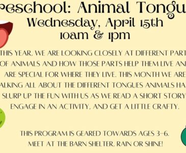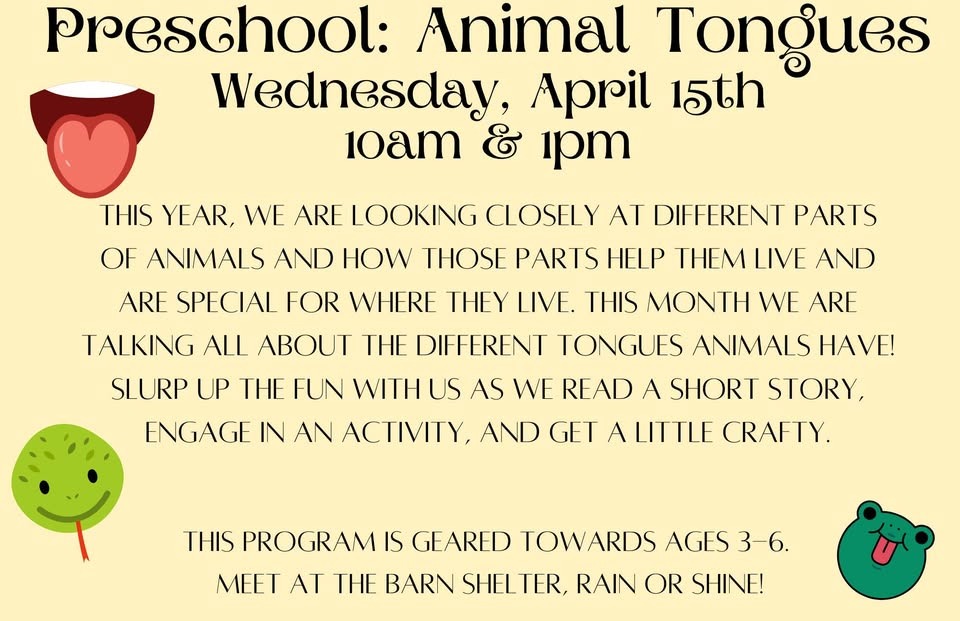 This year, we are looking closely at different parts of animals and how those parts help them live and are special for where they live. This month we are talking all about the different tongues animals have! Slurp up the fun with us as we read a short story, engage in an activity, and get a little crafty. This program is geared towards ages 3-6. Meet at the Barn Shelter, rain or shine!