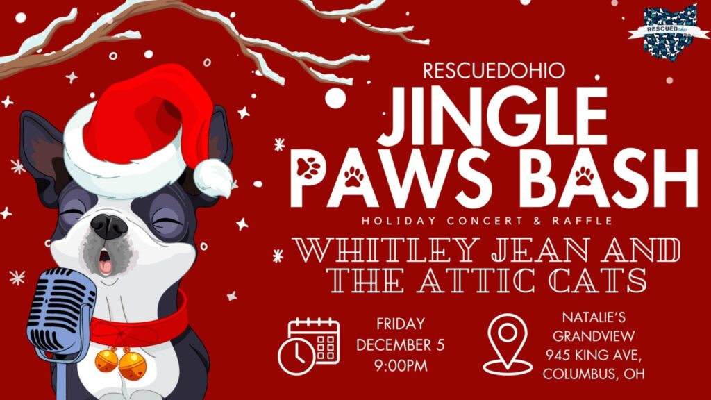 Join RESCUEDohio at the Jingle Paws Bash to help us provide second chances for every dog who enters our foster-based program. Our event will feature your favorite holiday music from Whitley Jean, as well as a raffle! A portion of ticket sales, as well as all raffle and merchandise proceeds from this event support the dogs in RESCUEDohio’s care. Come celebrate the season, have fun, and make a difference for our furry friends!