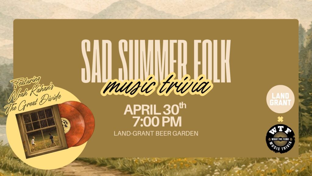From the heartfelt folk of The Lumineers, Noah Kahan, and Mumford & Sons to the soaring alt/indie of Mt. Joy, Florence + The Machine, and Royal Otis, we’ll challenge your memory of all the songs that make you smile and sigh. Sing along to Noah Kahan’s “The Great Divide”, sip a cold beer in the Land-Grant Beer Garden (weather permitting), and compete for prizes that might just make your heart a little lighter.