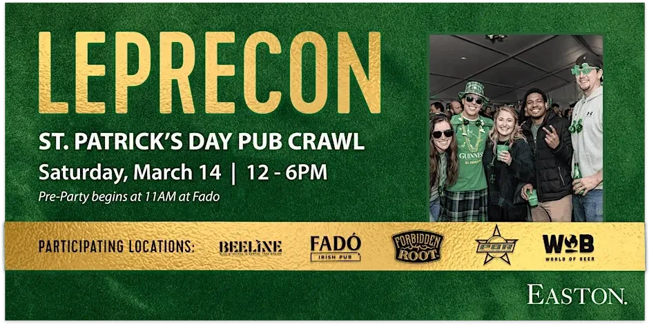Grab your crew and chase the rainbow – Leprecon St. Paddy’s Day Pub Crawl is coming to Easton on Saturday, March 14 from 12-6PM! Participating Locations & Sips Five bars. One legendary crawl. Plenty of Irish cheer. Do the shamrock shuffle across property to enjoy festive $8 Jameson cocktails and $5 shots at participating bars and restaurants including: • Beeline • Fadó Irish Pub • Forbidden Root • PBR Cowboy Bar • World of Beer Crawl Passport The Leprecon crawl passport is your golden ticket! Start your crawl by visiting any of the five locations to pick up a passport. Here’s how it works: 1. Collect a stamp at each stop when you buy a drink. 2. Turn in your completed passport at Beeline for the chance to win prizes at their after party. Featured Fun, Food and Prizes! Early birds can start the crawl at Fadó’s pre-party from 11AM-12PM – the legendary big tent party will be going strong with wall-to-wall St. Paddy’s Day energy and live music! Be sure to sit down for a bite to eat at Forbidden Root to enjoy Irish food specials like Beer Cheese Soup, Cod Fritters and Corned Beef Balls. When the clock strikes 5PM, make your way to Beeline for the official after party featuring a DJ, high-energy vibes, and special prize drawings for crawlers who turn in their stamped passports.