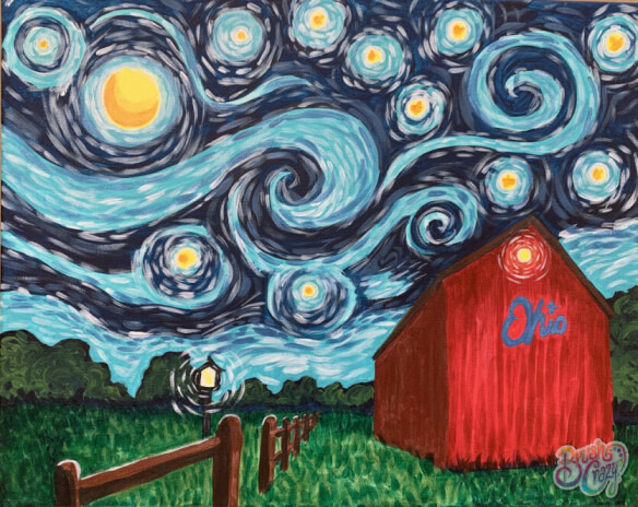 Come in and get a little Brush Crazy! Starry Night – Ohio is our featured painting. We have step by step instructions, with pictures and words for you to follow along as you customize your very own art project!