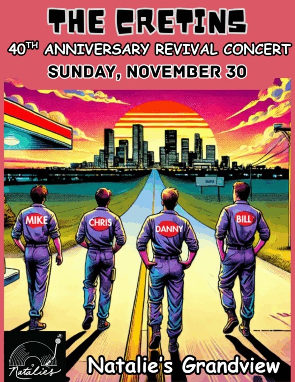 In 1985, four childhood friends from the South Side of Columbus first performed as The Cretins. Forty years later, they have lived to sing about it. And they all sing! Danny See (guitar, harmonica, keyboards), Bill Fridley (guitar), Chris Allwein (bass), Mike Fridley (drums) will bring their high-energy brew of memorable original songs and rock classics.
