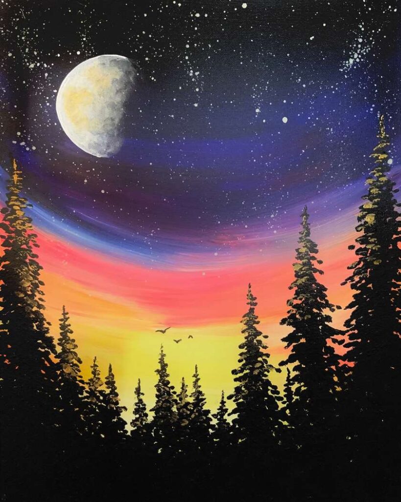 Those special couple of minutes where day and night kiss each other hello and goodbye. The sky is ablaze with the colors of the sunset or sunrise, yet we can also see the moon and glimpses of stars.
