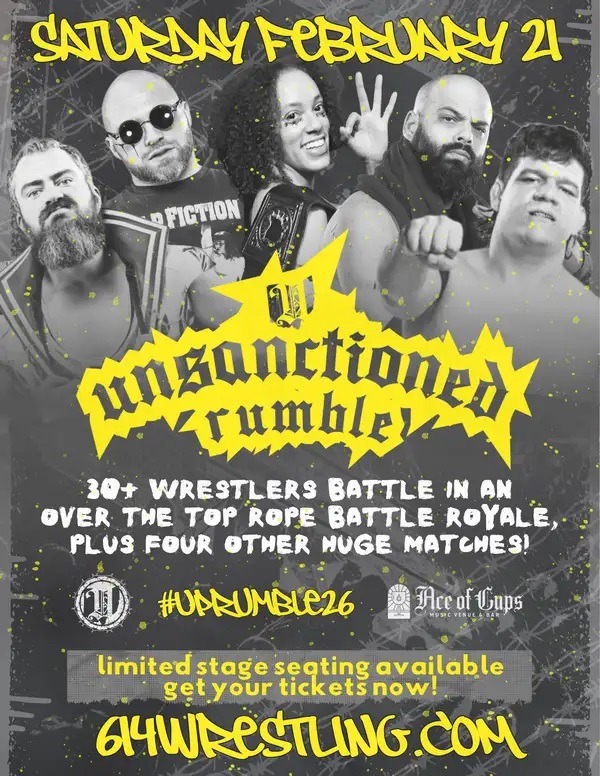 UP presents the second annual UNSANCTIONED RUMBLE on February 21 at Ace of Cups! *LIMITED* Stage seats are the ONLY available chairs in the venue - act fast if you don't want to stand. GA tickets are standing room only, and you can save $5 each with a party pack. $25 for one, party pack is 4 for $80! Minors welcome with an adult, but keep in mind this is a standing room only bar show.   Additional ticketing options here https://unsanctionedpro.bigcartel.com/product/unsanctioned-rumble-2026   Doors 7:15PM Show Begins 8PM *No refunds! No physical tickets mailed, purchaser must bring ID for door list day of show.* DISCLAIMER: By purchasing a ticket to this event, you acknowledge and accept the inherent risks associated with attending such performances, including the possibility of physical injury. Therefore, you release Ace of Cups venue and Unsanctioned Pro from any liability for personal injury that may occur during the event. Attend at your own risk. As always, if the action comes your way, MOVE!