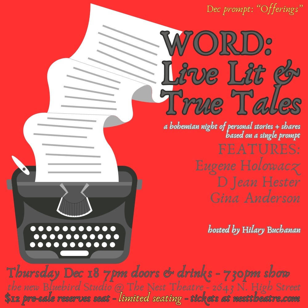 Word – Live Literature is a bohemian storytelling hour in the spirit of The Moth and other story shows, this will feature pre-scheduled storytellers. 4 scheduled features write stories to share on the prompt in this cozy, intimate evening of beauty. This month’s inspiration: Offerings