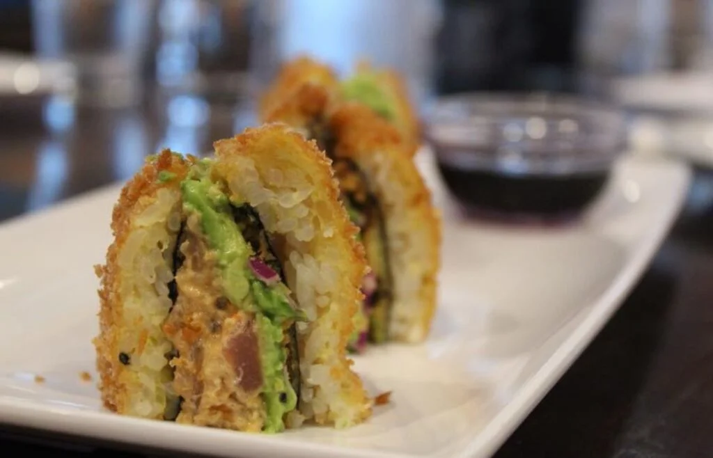 It’s made with with Panko fried rice patties, avocado, seaweed, and your choice of spicy tuna, spicy salmon, spicy crab, or just plain ol’ vegetable.