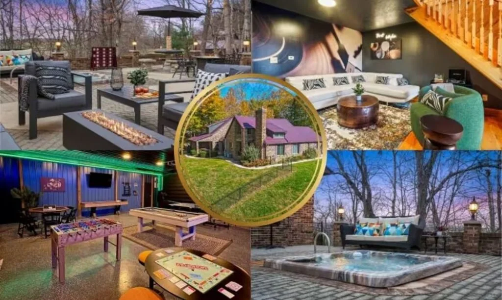 Traveling with a squad? This place sleeps up to 15 and comes with a climate-controlled game barn the size of a small rec center. Pool. Ping pong. Air hockey. Skee-Ball. Arcade cabinets. Shuffleboard. Basketball arcade. A hot tub with waterfall lighting. Plus five outdoor hang zones and sunset views. It’s basically a family reunion waiting to happen.