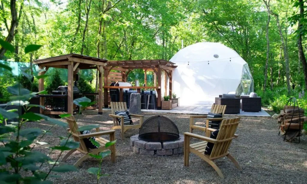 A clear-topped dome with direct river access, a private hot tub, a projector for movie nights, and Starlink Wi-Fi. The interior is cozy-cute with a queen bed facing the forest and a loft for extra sleepyheads. Outside you’ve got a pellet grill, firepit, and a furnished patio that says “we’re not leaving.”