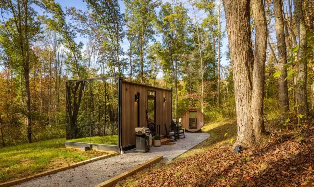Blink and you’ll miss it. This tiny modern stunner is wrapped in mirrored panels, so it melts into the trees. Inside it’s floor-to-ceiling windows, heated floors, a private sauna and hot tub, and a private hiking trail on 17 acres. Minimalist. Magical. Maximum romance.