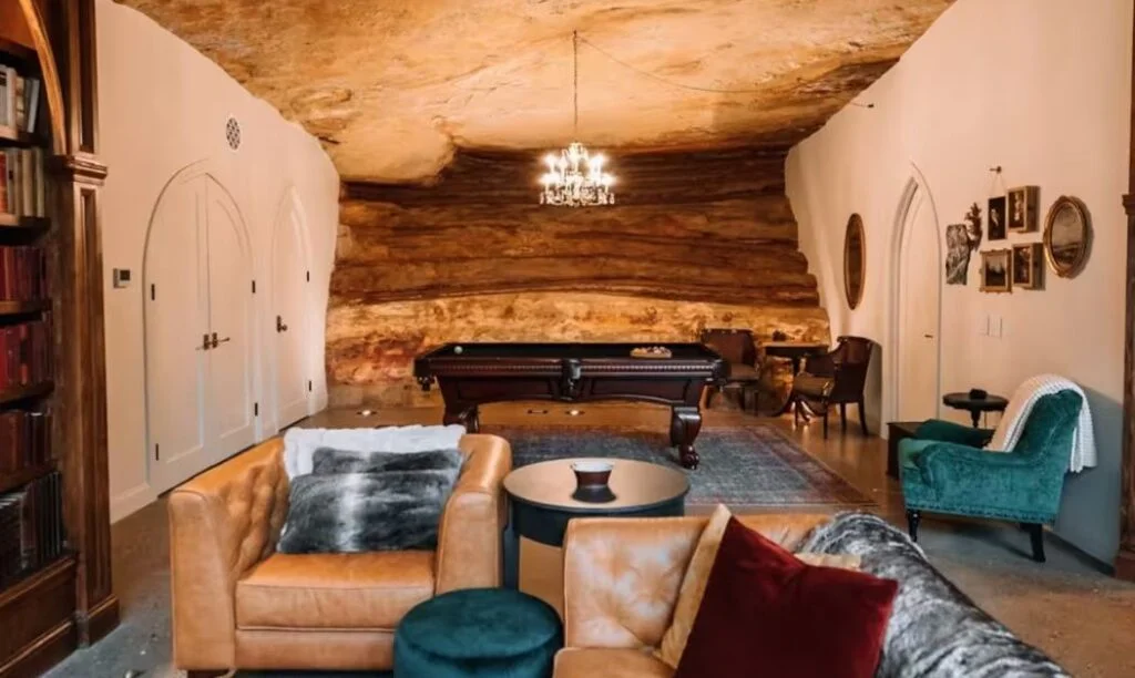 Yes, a real cave. Built into a natural recess cave, this 1,500-square-foot home has two king bedrooms, a gorgeous kitchen, a pool table, and private hiking. It books up fast because… it’s a cave you can sleep in. Kids and adults go full jaw-drop when they walk in.