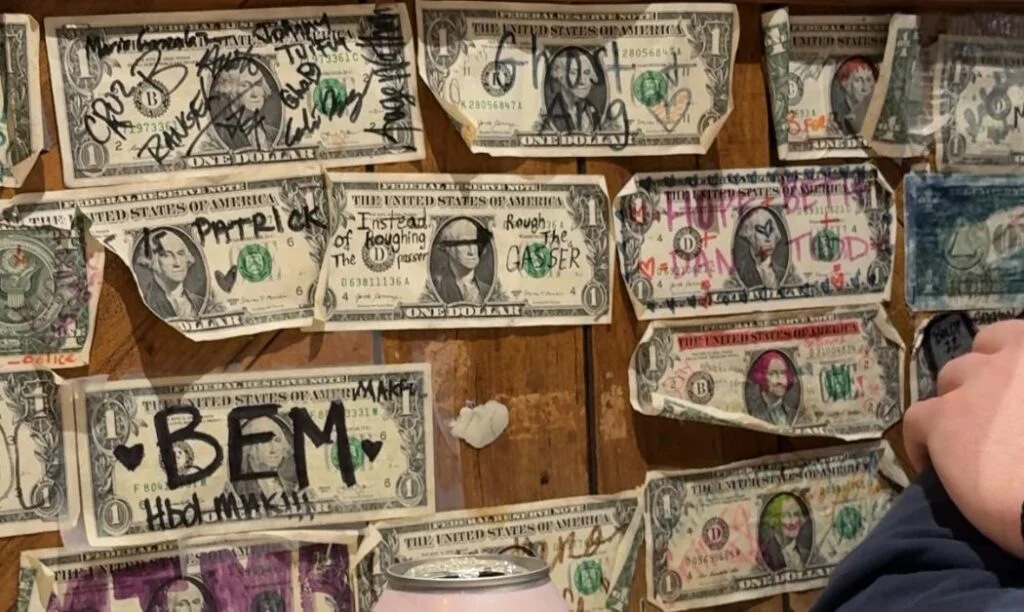 The walls and ceiling are coated in graffiti’d dollar bills, a nod to their legendary $1 can nights every Thursday. (Yes, still a thing. Yes, you should go.) The rest of the decor is an eclectic fever dream — think signed photos of Buddy Holly, glowing beer signs, the coolest rotating Budweiser Clydesdale snow globe light thingy, and just enough grit to keep it real. It’s like if your grandpa’s basement had a baby with a punk rock club.