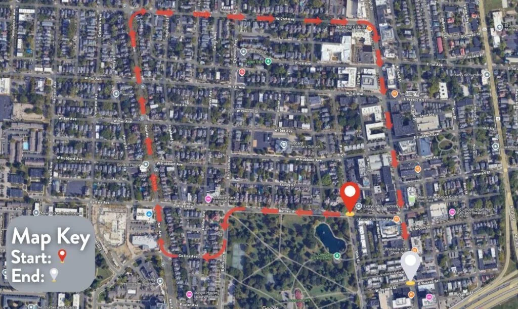 - From there, it heads west on Buttles, south on Dennison, west on Collins, north on Neil Avenue, east on Second Avenue, and finally south on High Street.